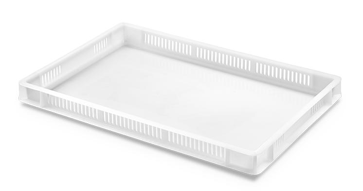 Der sehr flache Euro-Norm Kunststoffbehälter 600 x 400 x 55 mm eignet sich auch als Brötchenkiste oder zum Tranport von Canapes.