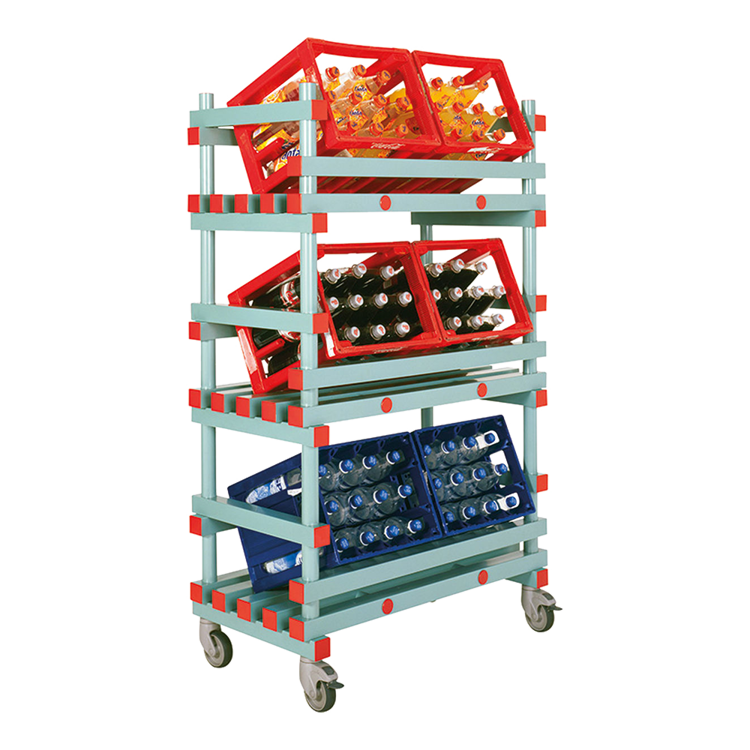 Der FR-Displaywagen ermöglicht eine übersichtliche und leicht zugängliche Aufbewahrung von bis zu sechs Getränkekästen. Die schräge Halterung sorgt für einfaches Entnehmen und stets guten Überblick.