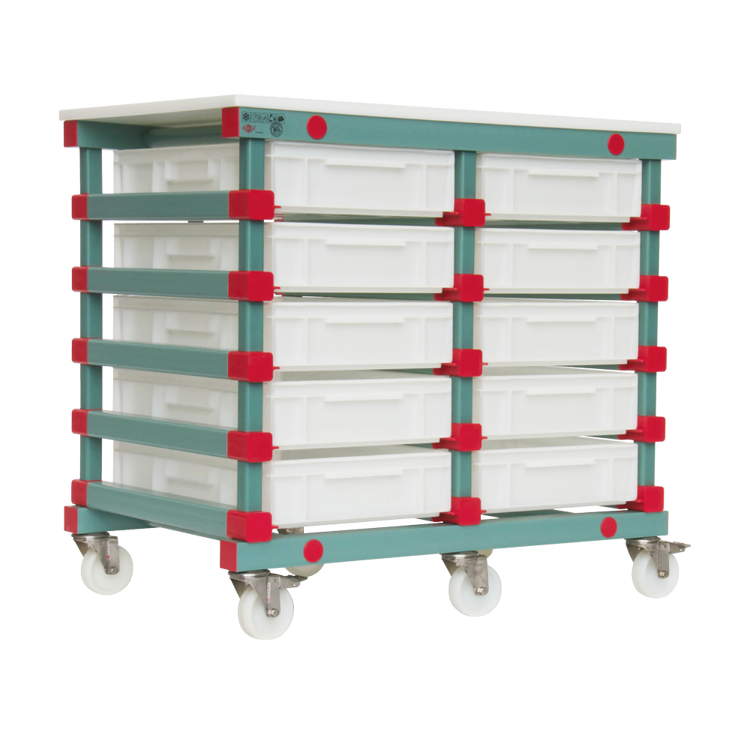 Der PT 2x5-Vorbereitungswagen sorgt für Ordnung und Effizienz am Arbeitsplatz. Mit Platz für zehn Kunststoffwannen und abnehmbarem PE-Arbeitsbrett bietet er hygienische, robuste und pflegeleichte Qualität ohne Schmutzansatzstellen.